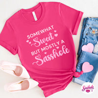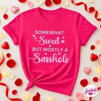 The “Somewhat Sweet, Mostly a Sasshole®” t-shirt is made for women who balance charm with sarcasm and wear both proudly. Playful, confident, and effortlessly funny, this tee is perfect for Valentine’s Day, Galentine’s plans, or everyday sass-filled outfits.